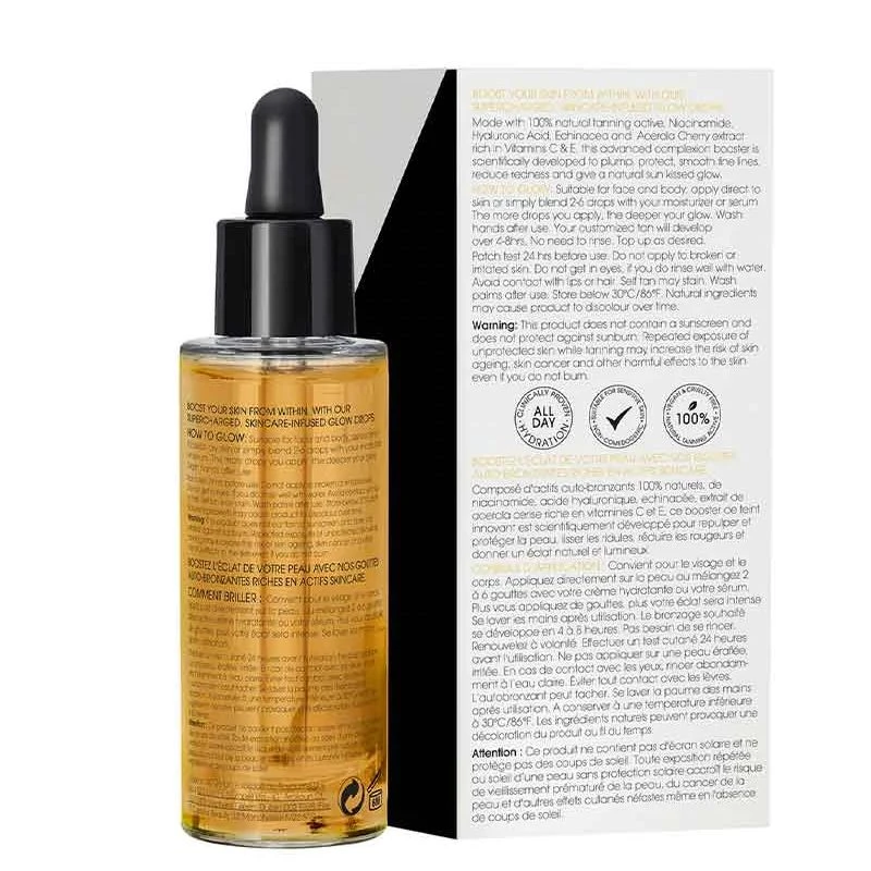 How to use: Suitable for face and body; apply direct to skin or simply blend 2-6 drops with your moisturizer or serum. The more drops you apply, the deeper your glow. Wash hands after use. Your customized tan will develop over 4-8hrs, No need to rinse. Top up as desired.